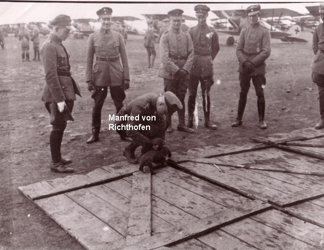 Führer Rittm. Manfred von Richthofen im Kreise seiner Staffelkameraden.